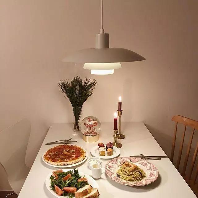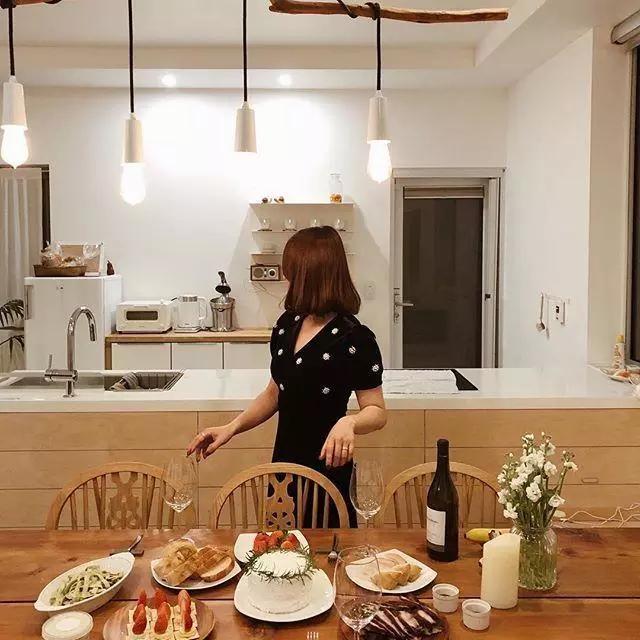 他們家有兩個吃飯的地方,一張小餐桌,日常兩人吃飯的時候使用。低垂的暖色燈光,讓用餐的氛圍變得更好,連外出進行燭光晚餐的場地費都省了,在家里就能享受安靜的二人世界。