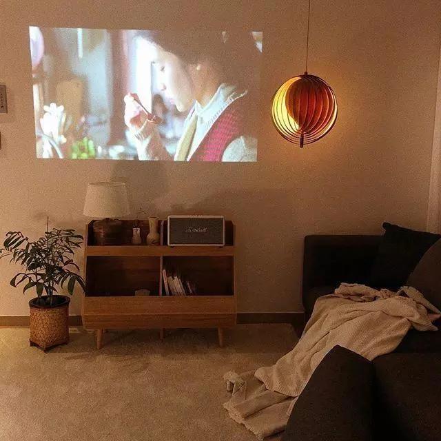 臥室的空間非常寬闊,落地床和暖色的燈光,讓整個家的家居氛圍變得更加溫暖,有了這個投影儀還能隨時隨處投影,觀看電影。