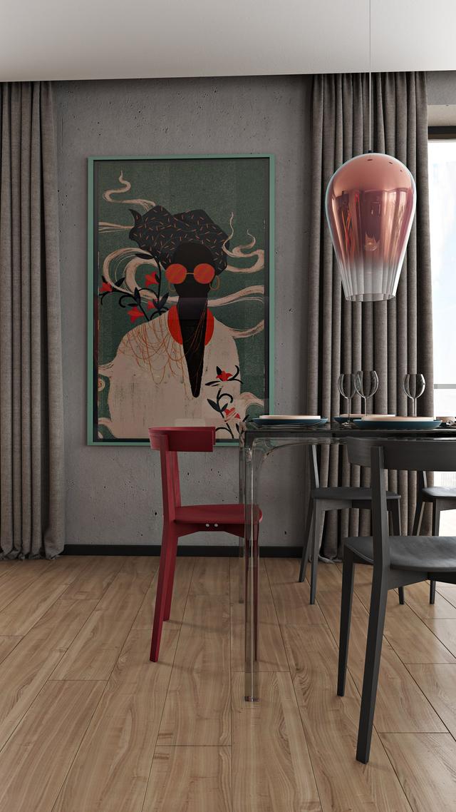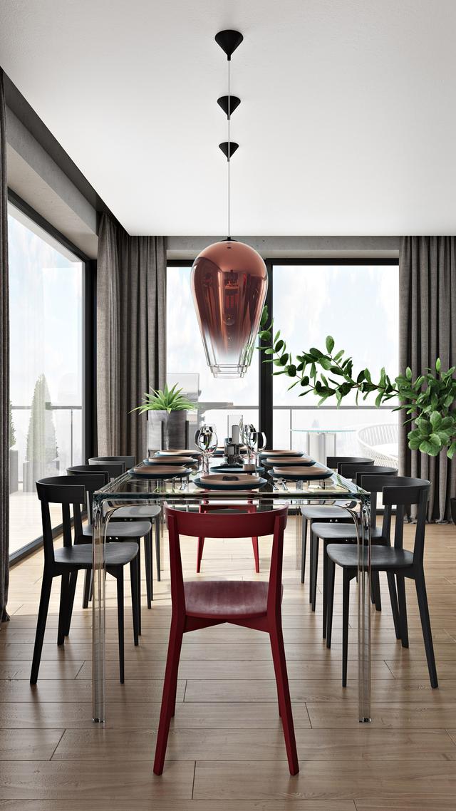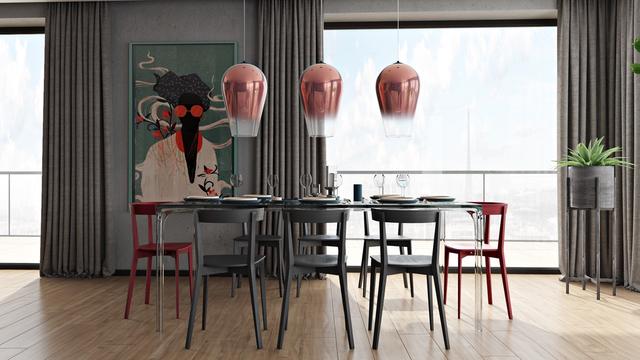 銅餐廳吊燈沿沙發后面的餐桌排成三排懸掛著。銅色調補充了藝術中的紅色調。兩把紅色的餐椅給桌子的頭和腳增添了色彩。在窗邊的角落里有一株小樹,長著一些綠色植物。