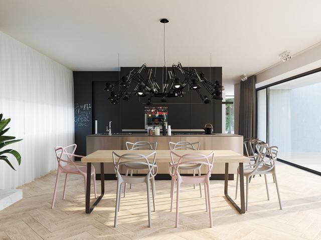 在餐桌上方掛著一個不規則的黑色現代吊燈,這就是Ingo蜘蛛吊燈。一張木質餐桌被米黃色和粉色的卡托大師椅所包圍。