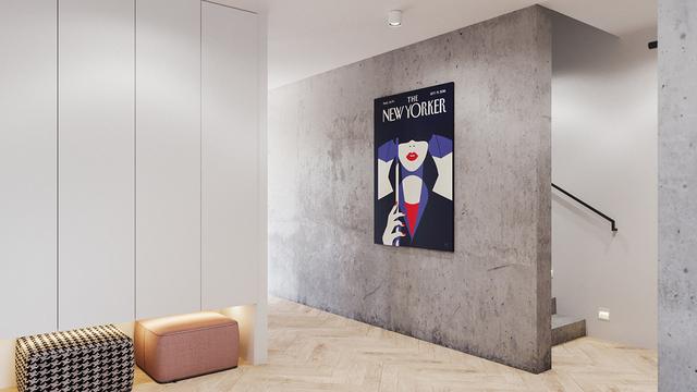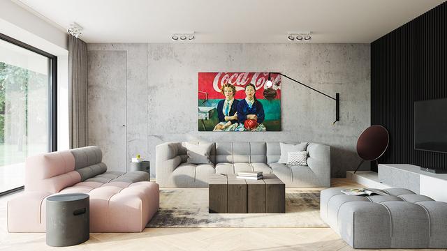 厚重的灰色窗戶與原始的混凝土墻壁形成色調。掛畫在當中尤為突出。