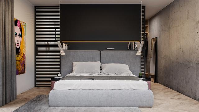 在主臥中,一張柔軟的灰色現代床的兩側各安裝了一扇黑色板條門。口袋門在床頭墻上滑動,露出右邊的壁櫥和左邊的套間浴室。五彩繽紛的墻面藝術為單色方案注入了勇敢的個性。