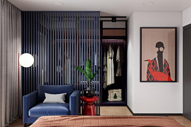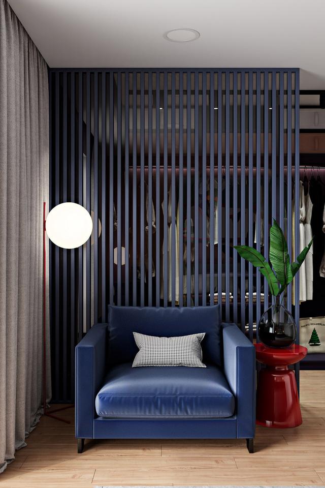 一張紅色的邊桌,加上藍色的臥室椅子和現代的落地燈,形成了一個別致的小休息區。