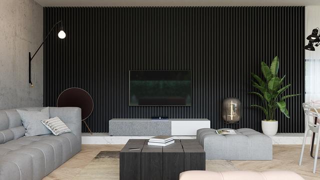 一盞Oda風格的燈立在一面黑色板條特色墻上。原件可以在這里找到。兩種色調的媒體單元與灰色的混凝土墻相匹配,在墻下有一個白色大理石壁爐。