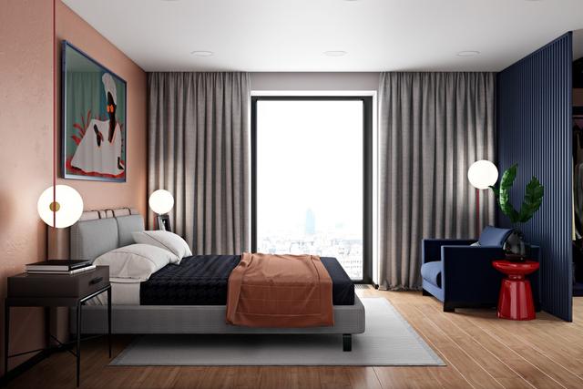 床罩是棕黃色的,以配合彩色的混凝土功能墻。溫暖中性的色調可以緩解紅藍兩種顏色的沖突。