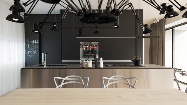開放式的房間由一個帶有金屬島的黑色單壁廚房完成。黑色的廚房墻壁可以用作筆記或個人藝術的黑板。一個鏡面光潔度的綜合器具在馬特黑色廚房儲物柜的中心發光。