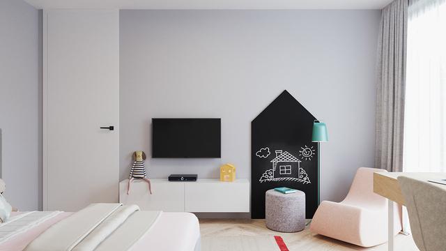 粉色在孩子的房間、床單和可愛的孩子椅子上又卷土重來。墻上的電視和房子形狀的黑板把黑色的基調帶進了孩子們的裝飾中。一個灰色的小凳子站在孩子新奇的黑板旁邊,提供了一個舒適的地方坐下來涂鴉。
