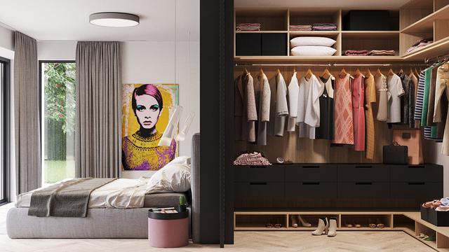 粉紅色的床頭柜和黑色的托盤頂部從床的兩側探出頭來;不同尋常的臥室吊燈照亮了每一盞燈。在床后的步入式衣櫥里有許多木制的架子,墻上放著用過較少的衣服,地板上放著一堆鞋子。黑色的抽屜柜排列在寬大的衣架下面。