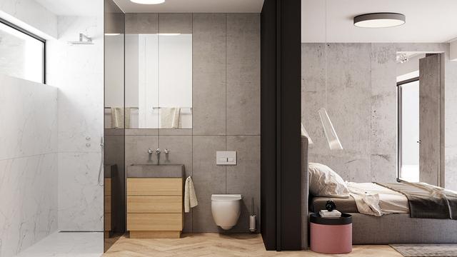 在另一側的套間浴室里,木質梳妝臺后面有一個混凝土面盆,墻壁上裝飾著混凝土。衛生間采用壁掛式,并配有壁掛式馬桶刷,保持了小房間的開闊感。輕大理石瓷磚覆蓋著帶有天窗的淋浴房。