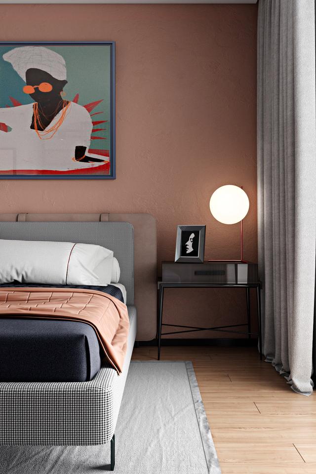 我們在主臥室里發現了更豐富多彩的現代藝術畫,它位于床頭板上方最顯眼的位置。一盞紅色的床頭臺燈照亮了床的一邊,與之配套的臥室掛燈照亮了床的另一邊。