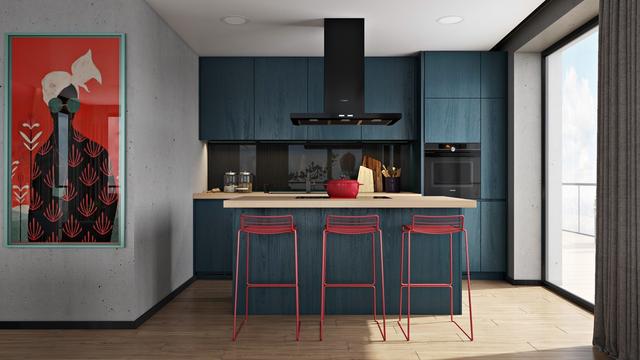 在開放式空間中,三個大紅的廚房吧臺凳沿著一個藍色的島嶼排列。他們是喜喜酒吧的椅子。