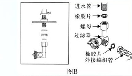 如圖所示將過濾器的螺母擰緊在進水管底部螺紋口上。然后將外接編織管也同樣擰緊在過濾器螺紋口上。(注:安裝時切勿漏裝橡膠片,否則會導致水箱漏水)