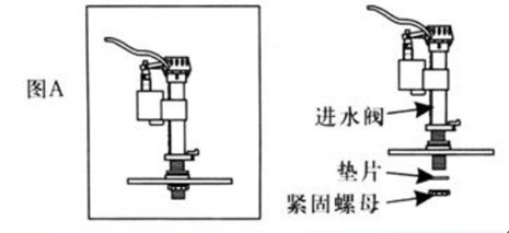 如圖所示將進水閥的零件取出。然后把調整好的進水閥裝在水箱進水孔上,再套上墊片,擰緊緊固螺母。(注:進水閥安裝的方向要確保補水管不能打折或阻礙其他零件工作)
