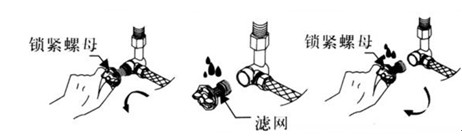 如圖將緊鎖螺母旋松取出用清水清洗濾網(wǎng)的泥沙,然后將鎖緊螺母裝回原位鎖緊即可。