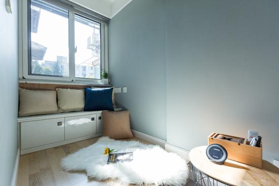 小夏是個貓性的女孩子,她喜歡貓肢體柔軟、常愛在主人懷中瞇縫著眼打瞌睡那懶懶的神情,讓人不由愛之憐之。但是她對貓敏感,所以用毛墊子來代替貓的溫柔。不管是早餐還是午后,陽光透過玻璃投影下來,斑駁的光影讓室內倍感溫馨。