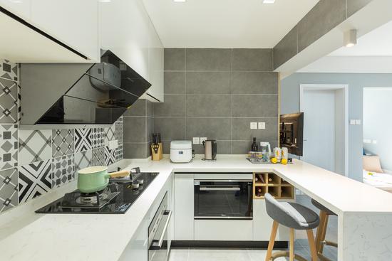 廚房可是小夏和設計師最用心的地方了,集成灶的便利,由左至右從冰箱取物-洗切-烹飪的動線處理,都體現(xiàn)了貼心。吊柜和櫥柜用了隱藏式拉手,保持簡潔干凈,讓小戶型廚房看起來更加寬敞舒暢。