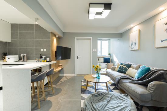 入戶就被撲入眼前的灰色調所包圍,這是一種能輕松營造高端大氣空間效果的色調。地面用了水泥自流平的瓷磚,如行云流水般地慢慢延伸。戶型較小,所以沒有做繁文縟節(jié)的吊頂,一盞清新簡單的吊燈點亮小世界。