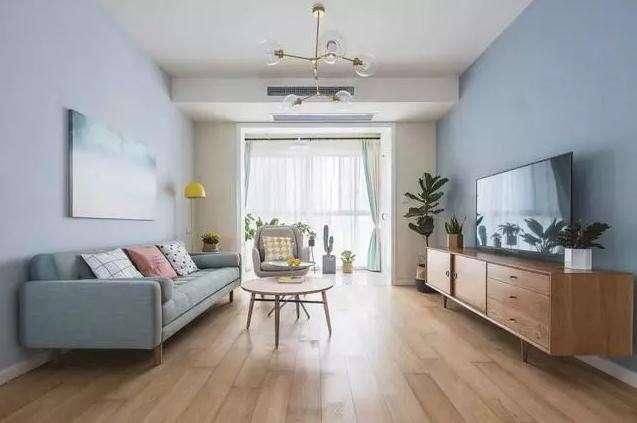 客廳原木色的地板,淺藍色的墻面,現代北歐風格的家具,與幾盆綠植共同營造了一個自然,溫馨,舒適的客廳氛圍。陽臺大大的落地窗配上雙色雙層的窗簾,幾盆綠植彰顯了高雅的生活品質。