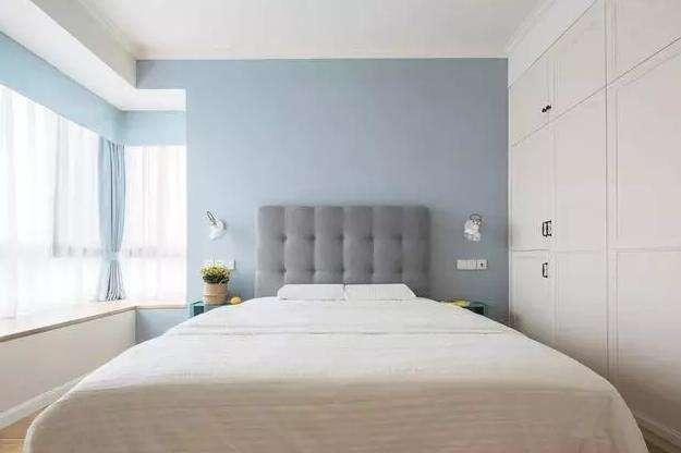 主臥,整體潔白無瑕的感覺,淺藍的墻面和窗簾在視覺上更加舒適。