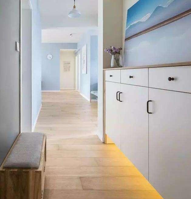 入戶玄關,半墻懸空式的鞋柜簡單實用,實木軟包的換鞋凳自然舒適。