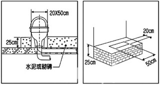 (3) 蹲式馬桶目前因構造關系,安裝前應在馬桶使用空間以水泥或砌磚等構筑方式加高25cm以上,切忌直接于樓板挖空埋入,并預留有20*50cm之空間。(如下圖)