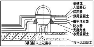 (7) 進行防水層之施工,并卷起防水層至馬桶跨面下彈性防水物質之上,并使之密接,再以灰泥壓上防水層,灌入固定用混土,待凝固后再以瓷磚或人造磨石等方式完工。