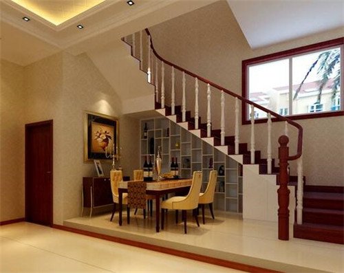 如果您家里還缺少一個餐廳的話,那么也可以考慮把餐廳安排在樓梯間了。房主人在樓梯下面打造了精致的酒架,雅致的餐桌擺放在酒架的旁邊。為了營造出溫馨的進餐氛圍,主人還在墻面上懸掛了精美的裝飾畫。
