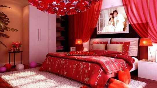既要展示出兩個人的個性又要營造出溫馨甜蜜的氛圍,易紅色或粉紅色為主,在布置上有幾個點:婚床、床品、抱枕、窗簾、窗紗、燭臺、玫瑰等。