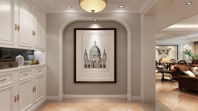 如果玄關比較窄,可以在墻面懸掛裝飾畫和好看的燈光搭配,做成一道畫廊,裝飾畫一定要注意大小和畫框高度以及間距。