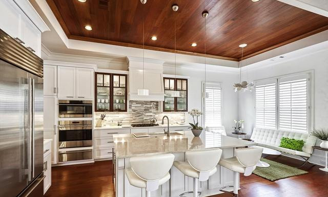 一個全白色的木天花板是一個美麗的添加到任何廚房,它有一個光滑的木材清潔線,同時寬敞和開放。再配上其他的白色裝飾,讓整個房間明亮起來。