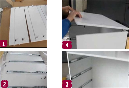 3、安裝柜體。先把柜體的側板上的白色塑料孔擰上螺絲,然后再裝上上面拆下來的寬的軌道,一個滑軌分別用兩個小螺絲一前一后固定。柜體的兩側都要安裝并固定。