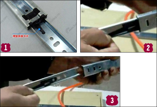 2、安裝抽屜滑軌首先需要把軌道拆開,窄的安裝在抽屜側板上,寬的安裝在柜體上,安裝時,滑軌下面平抽屜邊板下面,前面平抽屜邊板前面。大家要分清前后。