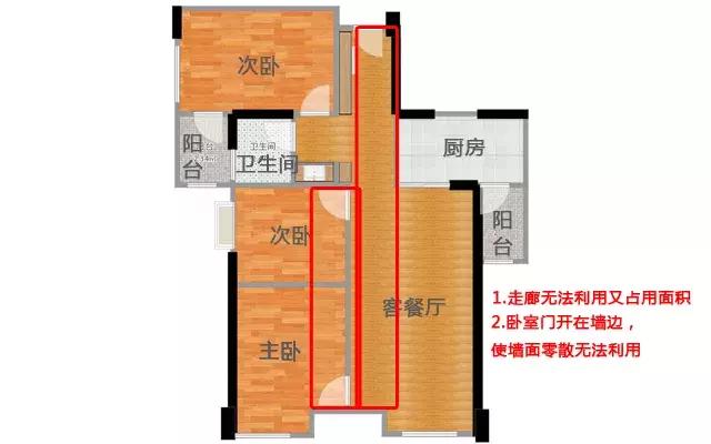 面積浪費多主要包括:①走廊過于長、沒和客餐廳等實用區域合并;