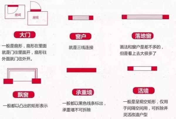 想要不被忽悠,關鍵還是自己要學會看戶型啦!入門小白請先把下面幾個戶型符號記熟: