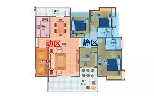 動區如客廳、餐廳、廚房和次衛等活動較為頻繁的區域,應該靠近入戶門,尤其是廚房。靜區如指臥室、書房和主衛等,應該布置在戶型內側區域。