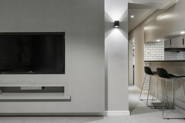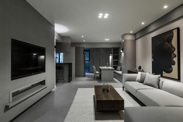 灰色水泥質(zhì)感地面奠定了一份現(xiàn)代氣息,天花板上無主燈的照明裝置更是干凈簡(jiǎn)潔。