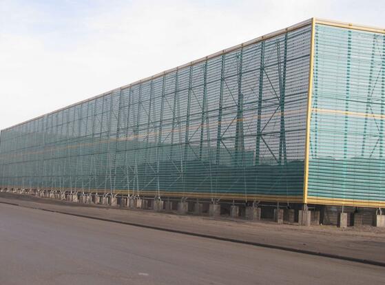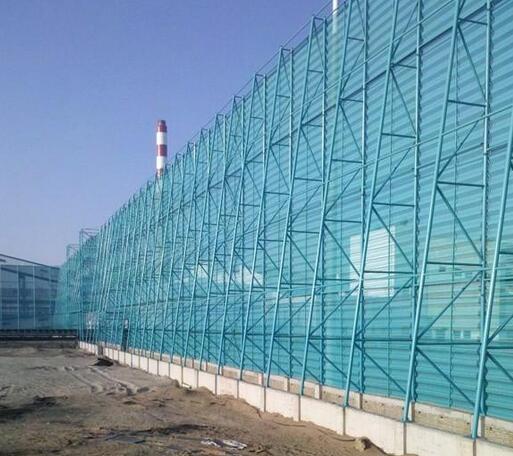 (3)擋風板安裝:使用壽命15~20年。使用環境溫度:-40℃至+80℃,連接采用螺釘和壓板固定。擋風抑塵扳的具體尺寸、彎曲度、開孔率應根據堆場的實際情況進行設計。