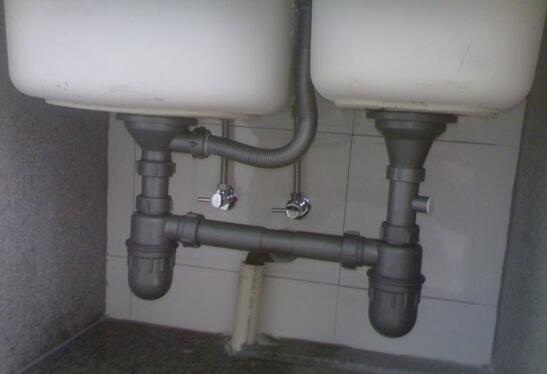 多個下水的連接:有時廚房有多個下水,就需要加三通來連接,三通可豎接、橫接及斜接。有時可能地方不夠,就需要把三通鋸短,或變換方向接,還要說一下三通管件,這管件中間的出水口大都是90度,還有一種中間是斜的,這樣的好用,選管件時盡量選這樣的,可少用一個45度彎頭,還有四通,多種管件連接時,用四通更好,用這些水件能變換出很多形狀,管件的出口可前后左右裝,在水槽狹小的地方,必須這樣來回試,才能找到最佳的位置。