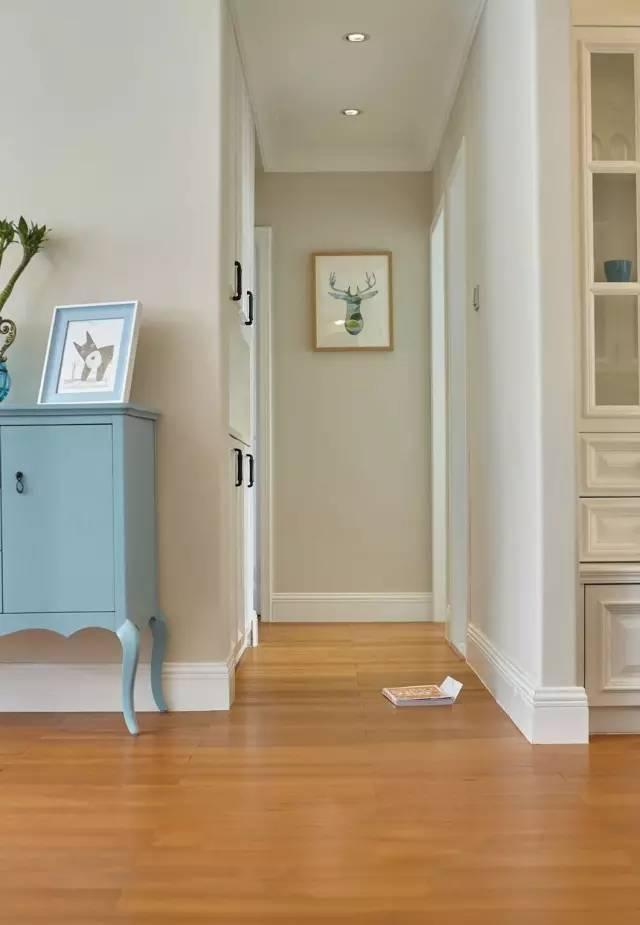 玄關(guān)裝修設(shè)計(jì)簡潔利落,淡色墻壁與純木色地板將體現(xiàn)出來力謙讓給了藍(lán)色裝飾柜。