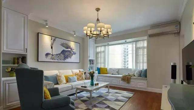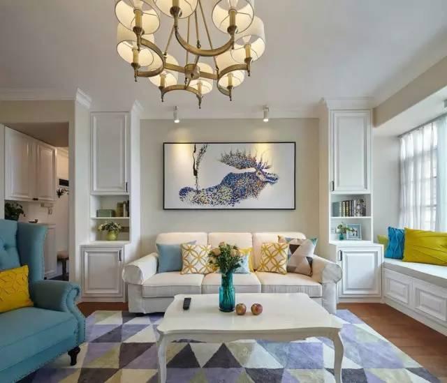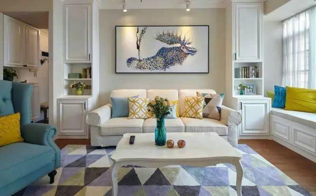 從一束鮮花,三個兩個檸檬黃色和淺藍(lán)色枕頭,一個掛在沙發(fā)墻上的彩色麋鹿,整個空間色彩設(shè)計(jì)的非常的好,提高了不少的裝飾效果。