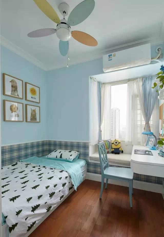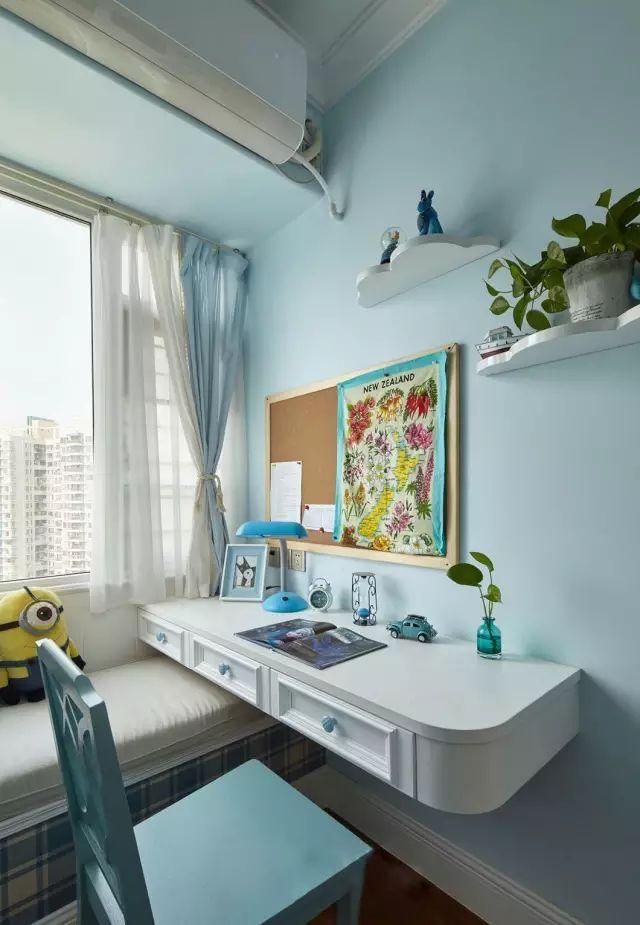 在家居空間里,設(shè)計(jì)師以藍(lán)色作為空間打底色,同時以窗簾、椅子與床品上的一抹藍(lán)色作為色系延展,而墻裙則豐富了底色。