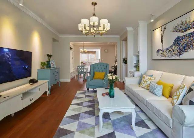 柔軟的沙發(fā)、弧線優(yōu)美的茶幾與電視柜的白色系幾乎不占據(jù)視覺空間,一張清冷色軟地毯的適當(dāng)嵌入,恰好潤澤了視覺飽滿度。