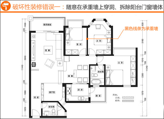 ??? 正確做法:承重墻的重要性即使是裝修菜鳥也大多都了解,因此隨意拆改承重墻的行為應該來說比較少。不過很多情況下是因為沒有分清承重墻與非承重墻,而將承重墻誤拆掉。因此,裝修小白們還是要先了解一下怎么準確區分承重墻與非承重墻。