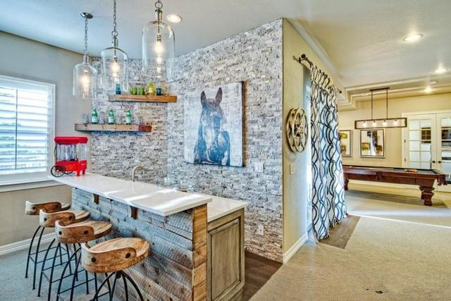 讓我們愛上了這個華麗的地下酒吧區,我們喜歡這個富有紋理的特色墻和整個角落的農舍——雖然很時髦——的品質。開放式貨架,甚至是爆米花機的加入,都是如此的溫馨和美好!