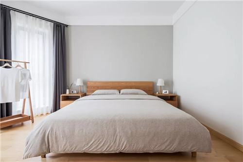臥室布置簡約之至,木質床架和家具盡顯清晰自然質感,在簡約淺灰的墻面、窗簾、暖灰的床單,打造出舒適的睡眠空間。