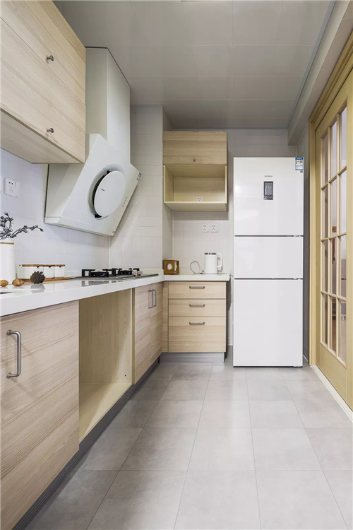 將白色與淺色的原木融合在一起,恬靜素雅,恰到好處。淺色原木的一體式櫥柜自然地融入白色的背景墻中,營造了寬敞的視覺空間,簡約、干凈、整潔。