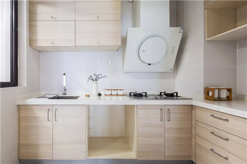 小面積的廚房,以L型的布局,把沖洗、烹飪、備餐區合理地分布在一條線上,讓做飯的小空間顯得實用而又輕松。