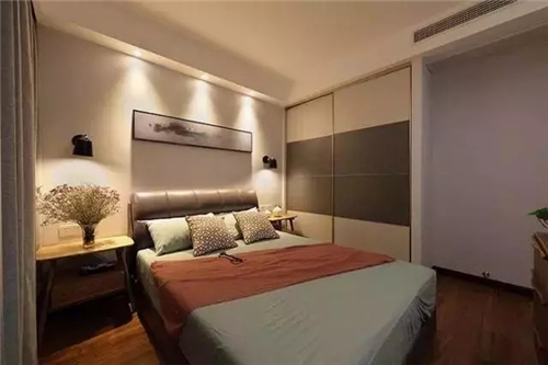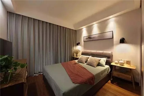 主臥用床頭的三盞射燈和對稱壁燈代替了主燈,皮靠墊的床頭設計很是巧妙,半靠著玩手機、看電視,簡直不要太美好。