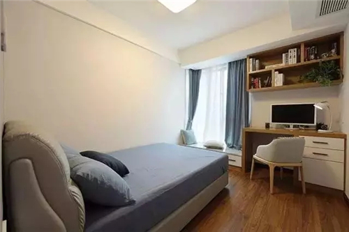 次臥的面積較小,為了實現功能的最優,退而求其次地把床頭擺到靠房門的這面墻。