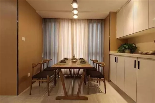 半透光的窗簾,恰巧形成冷暖漸變的過渡色;通頂的餐邊柜,中間留出空位則可以隨意擺放餐具或綠植。